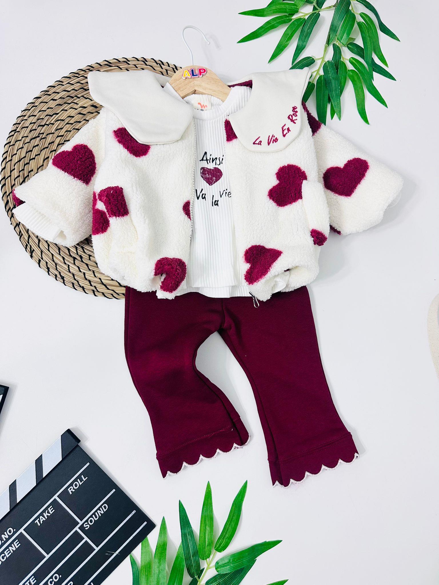 Yakası Nakışlı Kalpli Peluş Ceketli 3'Lü Takım (ALP123676)